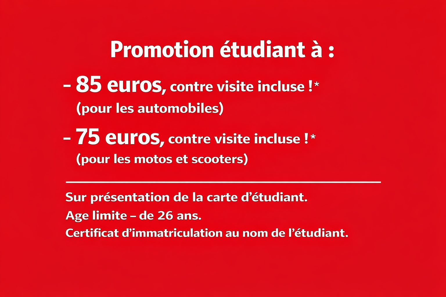 – 85 euros, contre visite incluse ! * (pour les automobiles)